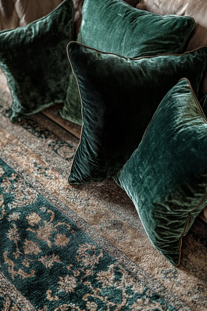 Visualize a room with a soft, plush rug in deep forest green underfoot, complemented by velvet pillows in varying shades of green and teal. The mix of textures creates depth and visual intrigue, making every surface inviting. Soft lighting highlights the pile and sheen of the fabrics, enhancing the luxurious feel. It’s a space that beckons you to sink in and relax.