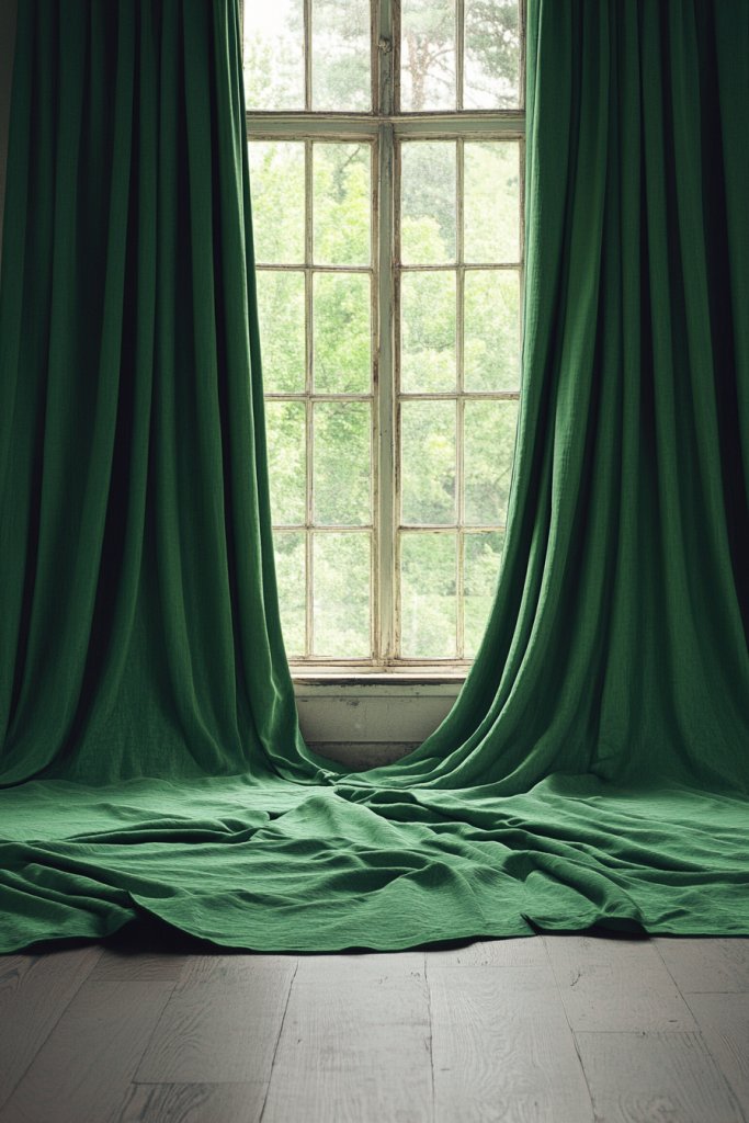 Picture floor-to-ceiling curtains in deep forest green fabric, softly pooling on the floor. During the day, sheer green drapes filter sunlight gently, creating a warm glow. When closed, they block out harsh light and add privacy, transforming the space into a cozy cocoon. The fabric’s texture—whether matte, velvet, or linen—adds depth and richness, complementing your overall decor.