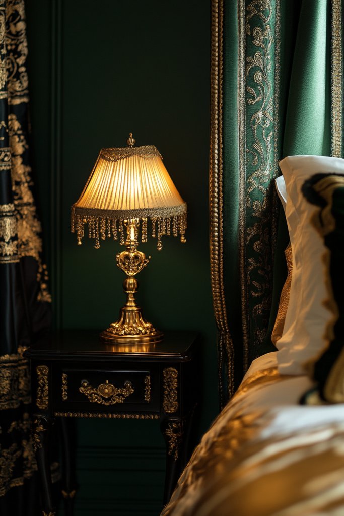 Want to add a bit of glamour to your moody green bedroom without going overboard? Gold and brass accents are the perfect subtle luxe touches that elevate the entire space. They add warmth and sophistication, making your retreat feel more polished and luxurious. Who says you need a palace for a touch of royalty?