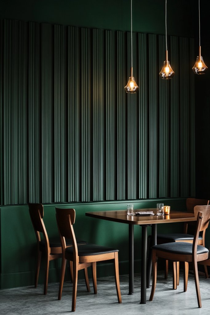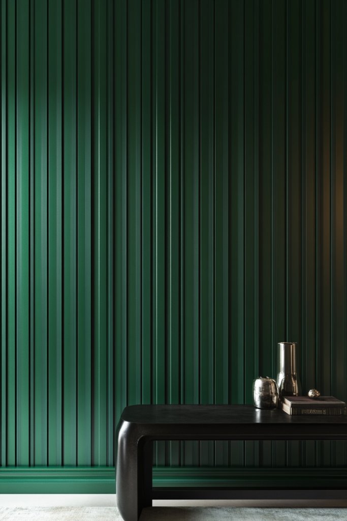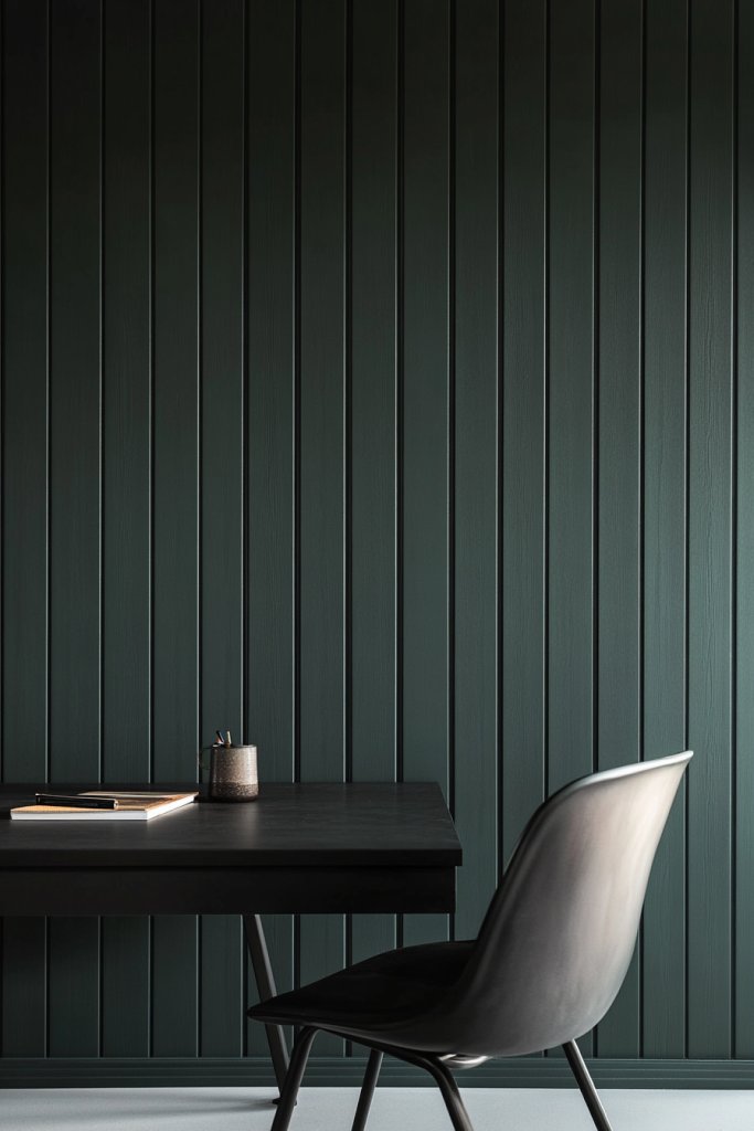 Imagine a wall painted in a deep charcoal green with tall, vertical panels running from floor to ceiling. The matte finish absorbs light, reducing glare and creating a calm, focused ambiance. The vertical paneling adds architectural interest, making the room feel taller and more spacious. The textured surface invites touch and adds a tactile layer of sophistication. Paired with minimalist furniture and metallic accents, this setting exudes confidence and modern elegance.