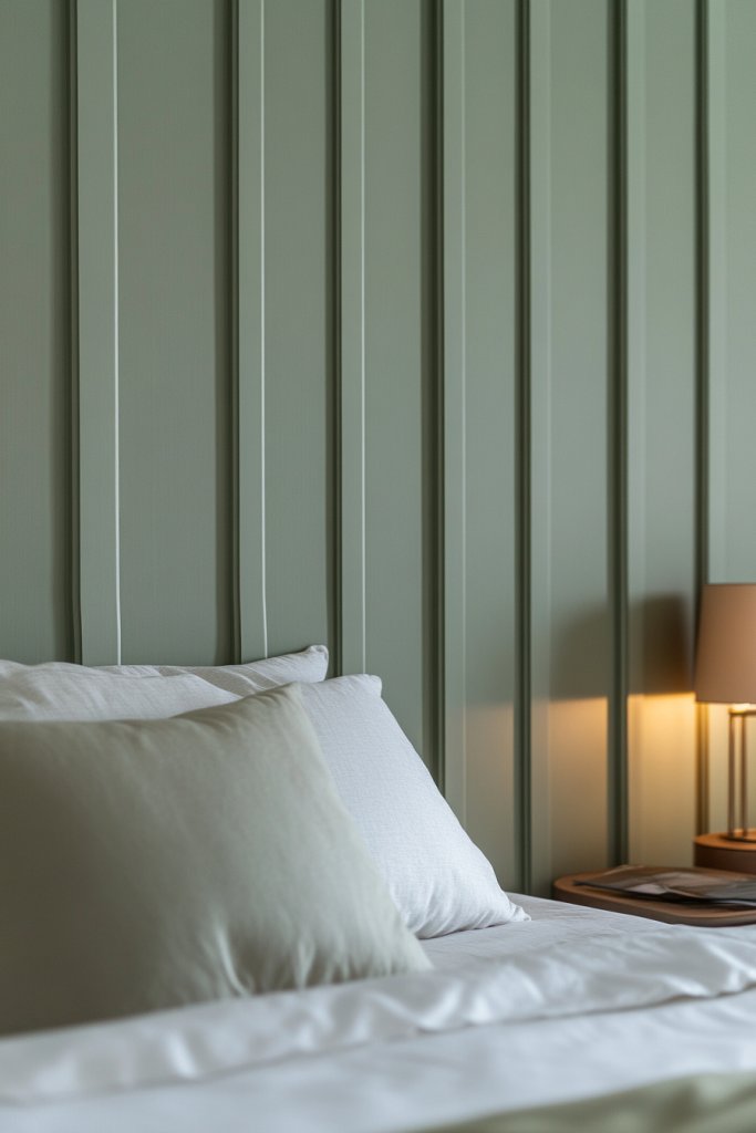 A sage green vertical batten wall elevates your bedroom into a peaceful sanctuary. It’s a simple yet effective way to add architectural interest and depth. DIY-friendly and customizable, this look proves that small design details can make a big impact. Your space will feel more inviting and calming, encouraging better sleep and relaxation.