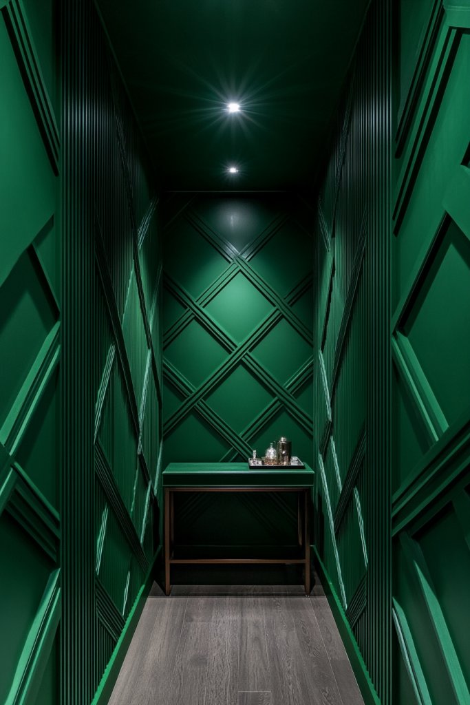 A geometric batten pattern in a deep green hallway proves that bold design choices can elevate even the most overlooked spaces. It’s a DIY-friendly project with a high-impact result. This design demonstrates how simple shapes and thoughtful placement can create a striking feature. Your hallway will become a conversation starter and a reflection of your creative style.