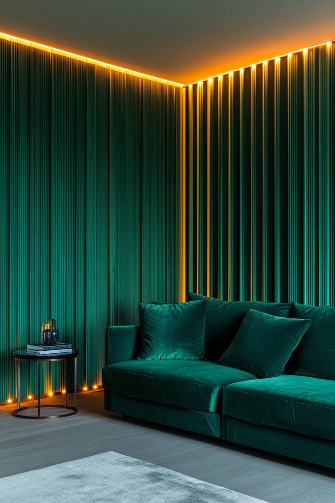Want to add a touch of luxury to your living room without overwhelming the space? Hidden lighting behind batten grooves in emerald green walls creates a warm, inviting glow that’s both modern and sophisticated. It’s a subtle upgrade that makes your space feel more dynamic and cozy at the same time. Who doesn’t love a little secret lighting?