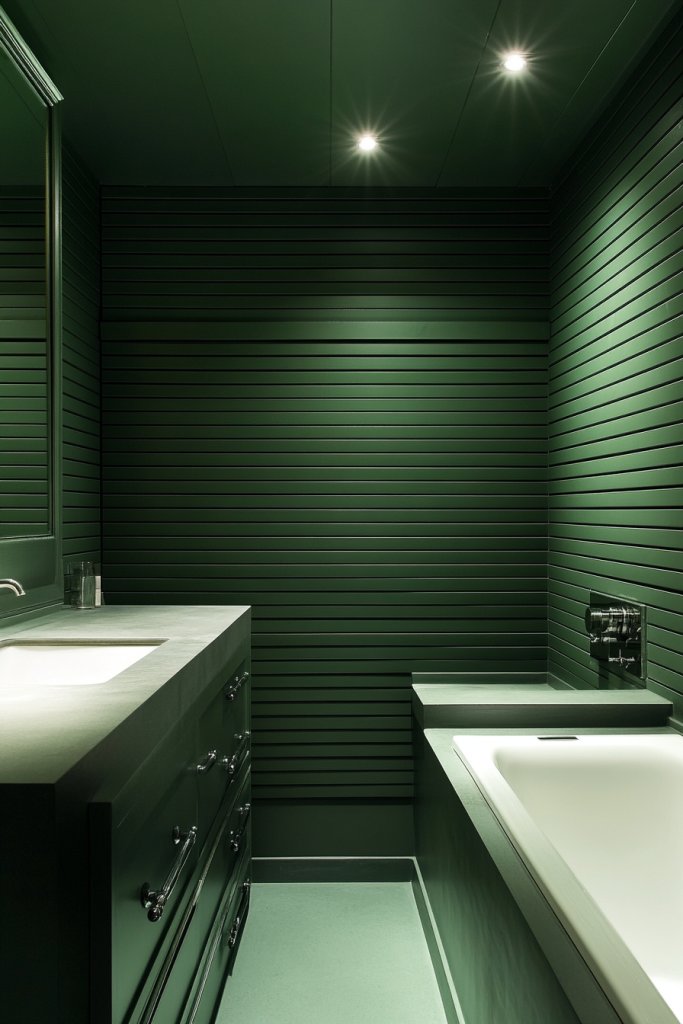 15. Forest Green with Narrow Horizontal Batten Strips in the Bathroom