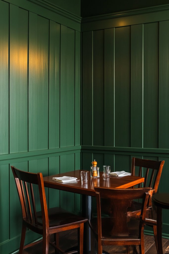 Visualize dark green faux wood grain panels covering the walls, with the grain pattern adding visual richness. The matte finish minimizes glare, creating a soft, velvety backdrop. The textured surface provides a tactile element that invites touch. Soft lighting highlights the grain’s natural variations, emphasizing the authentic look. This setup makes your dining nook feel like a rustic retreat or a modern forest-inspired space.