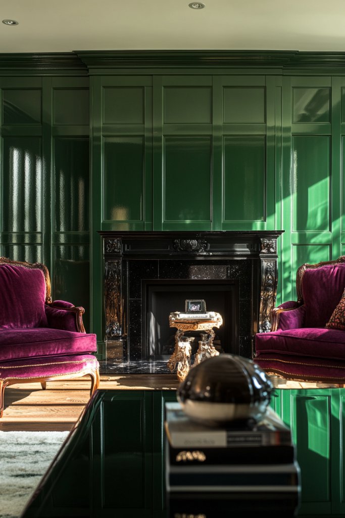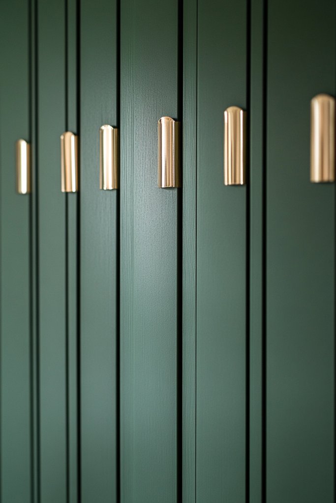 Adding metallic accents to batten tips in a moody green wall instantly elevates your decor to glamorous heights. It’s a simple, customizable project that adds sparkle and sophistication. The combination of matte green and metallic shimmer creates a rich, layered aesthetic. Your space will radiate style, and you’ll feel confident showcasing your luxurious taste.