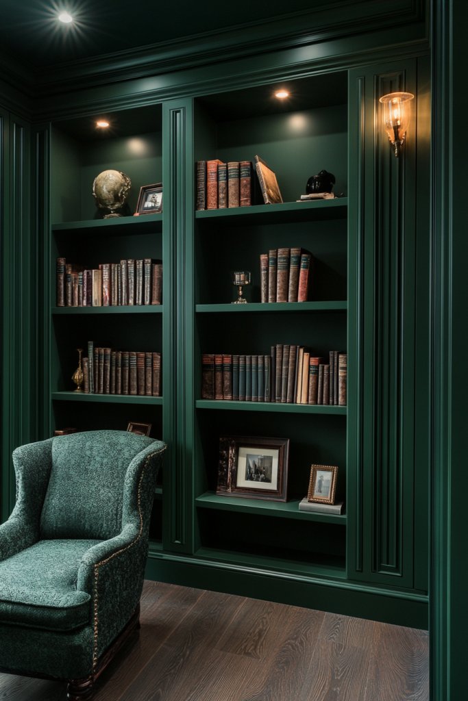 Picture walls painted in a deep jade hue, with tall, slender battens running vertically from floor to ceiling. The matte finish absorbs light, creating a quiet, contemplative atmosphere. The narrow battens add texture and height without cluttering the space, emphasizing the room’s verticality. Soft lighting highlights the shadows cast by the battens, adding depth and mystery. Layered shelves filled with books and decor complete the inviting, scholarly ambiance.