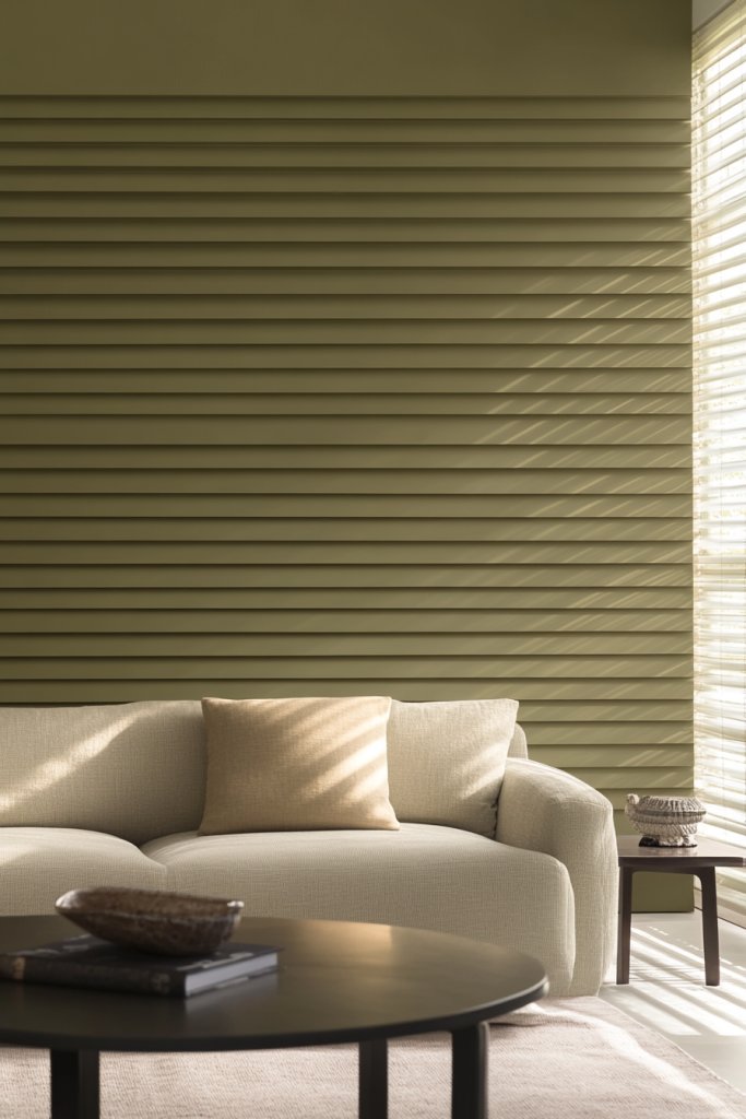 Picture a warm, inviting living room with walls painted in a soft matte olive green. Horizontal battens run across the wall, evenly spaced to add texture and a sense of rhythm. The matte finish absorbs light, reducing glare and creating a cozy atmosphere. The clean, straight lines contrast beautifully with plush textiles and soft furnishings, making the space feel both modern and approachable. The subtle texture invites you to touch and explore the wall’s layered design.