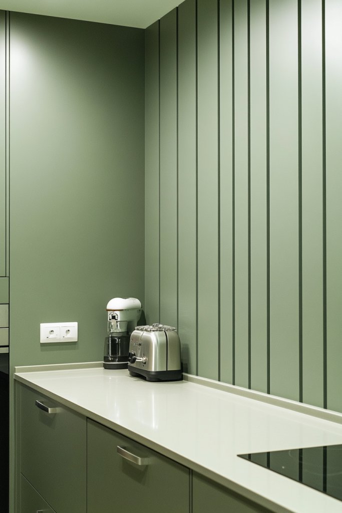 Picture walls painted in a soft, muted sage with thin, vertical battens running from floor to ceiling. The matte finish absorbs light, reducing glare and creating a peaceful environment. The simple lines give the illusion of height, making the room feel more spacious. The battens’ subtle texture invites the touch, while their minimalist arrangement keeps the look clean and fresh. Light-colored cabinets and countertops complement the soft green, completing a calm, cohesive look.
