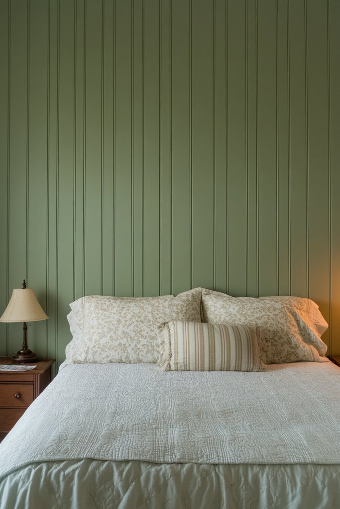 4. Moody Sage Green with Narrow Vertical Batten Pattern in the Bedroom