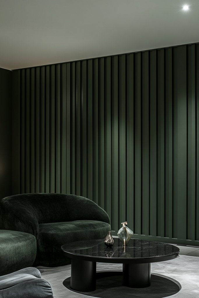 21. Rich Green with Layered, Shadowed Batten Panels for a Dramatic Focal Wall