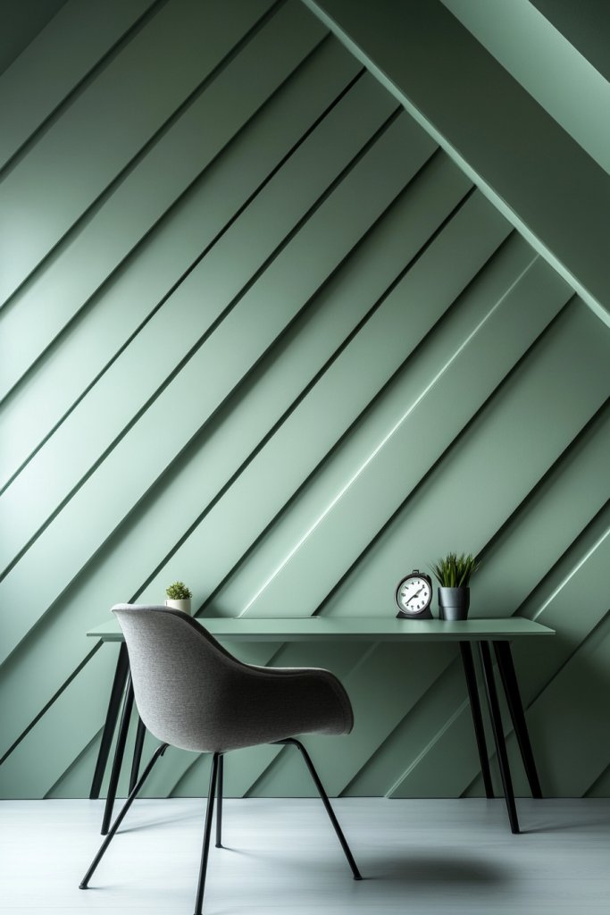 Picture moss green walls adorned with diagonally placed battens, creating a chevron or herringbone pattern. The textured battens add depth and movement, drawing your eye across the space. The subtle green tone keeps the room calm and focused, while the diagonal lines introduce a sense of energy. Soft lighting highlights the angles, casting intriguing shadows that make the design pop. It’s a clever way to infuse personality into a functional space.