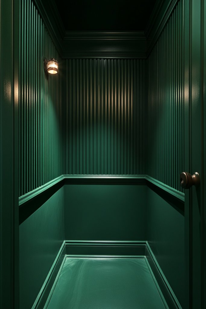 Imagine a compact powder room painted in a deep jade hue with delicate shadow lines running vertically or horizontally. The matte finish softens reflections, creating a velvety, sophisticated look. Subtle shadowing makes the battens or paneling appear to recede, adding depth without clutter. Soft lighting, like wall sconces or concealed LEDs, enhances the moody vibe, casting gentle glows. The overall effect is both calming and luxe, perfect for small spaces that need a big style boost.