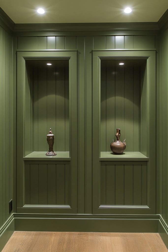 Visualize olive green walls with built-in recessed niches framed with matching or contrasting battens. The niches are deep enough to hold everyday essentials or decorative accessories like sculptures or textured ceramics. The matte finish absorbs light, emphasizing the clean lines and architectural depth. Soft lighting inside the niches highlights their contents and adds a warm glow. The overall effect is sleek, organized, and inviting—a perfect balance of form and function.