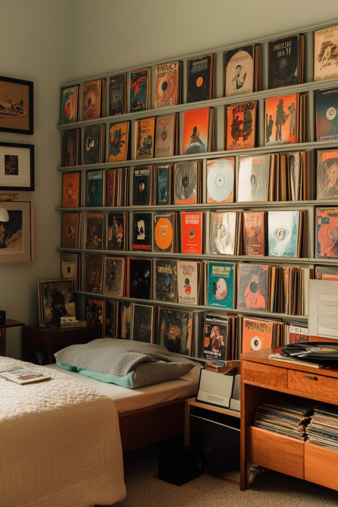 Imagine a wall lined with colorful album covers arranged in a neat grid or eclectic pattern. The glossy surfaces reflect ambient light, creating a vibrant mosaic of your music taste. Surround these with subtle LED backlighting or warm wall sconces for a cozy glow. It feels like walking into a personal museum of your musical journey.