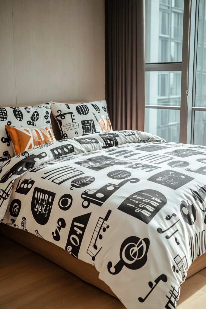 Picture a soft duvet cover adorned with musical notes, band logos, or colorful instruments. Complement it with pillows featuring lyrics, album art, or iconic symbols. The textures—like embroidered notes or printed graphics—make the bed a focal point. When you enter, you’re greeted by a vibrant, music-inspired oasis.