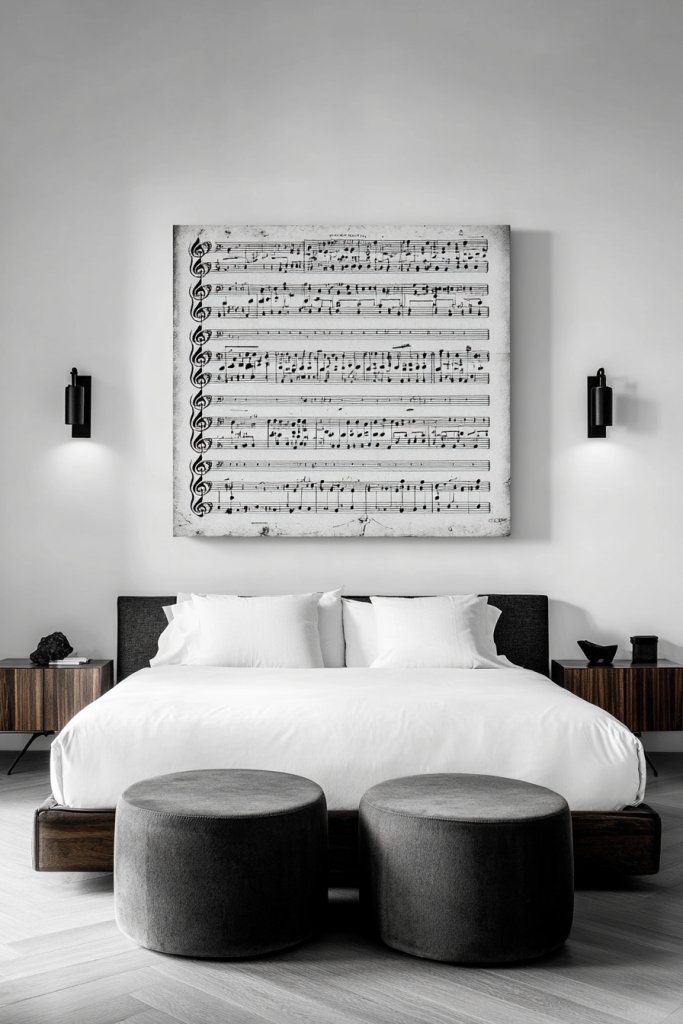 Looking for a bold, artistic focal point that’s both meaningful and stylish? A large canvas print of sheet music or a favorite song’s lyrics can transform your bedroom wall into a visual symphony. It’s perfect for music enthusiasts craving a statement piece that celebrates their passion.