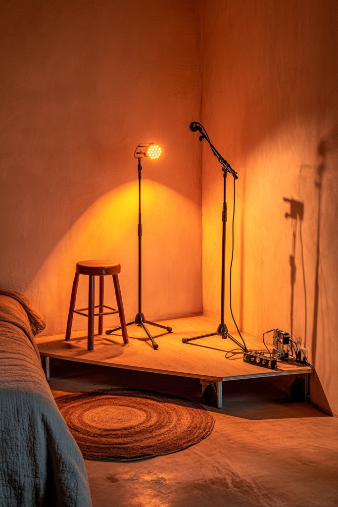 Visualize a small elevated platform with a microphone stand, a stool, and theatrical lighting. The area is framed with colorful curtains or textured wall panels, creating a stage-like atmosphere. When you perform or practice here, it feels like a real show. Even when not in use, it’s an inspiring focal point.
