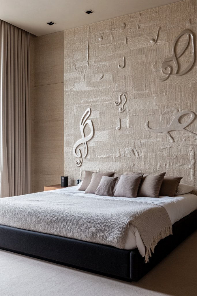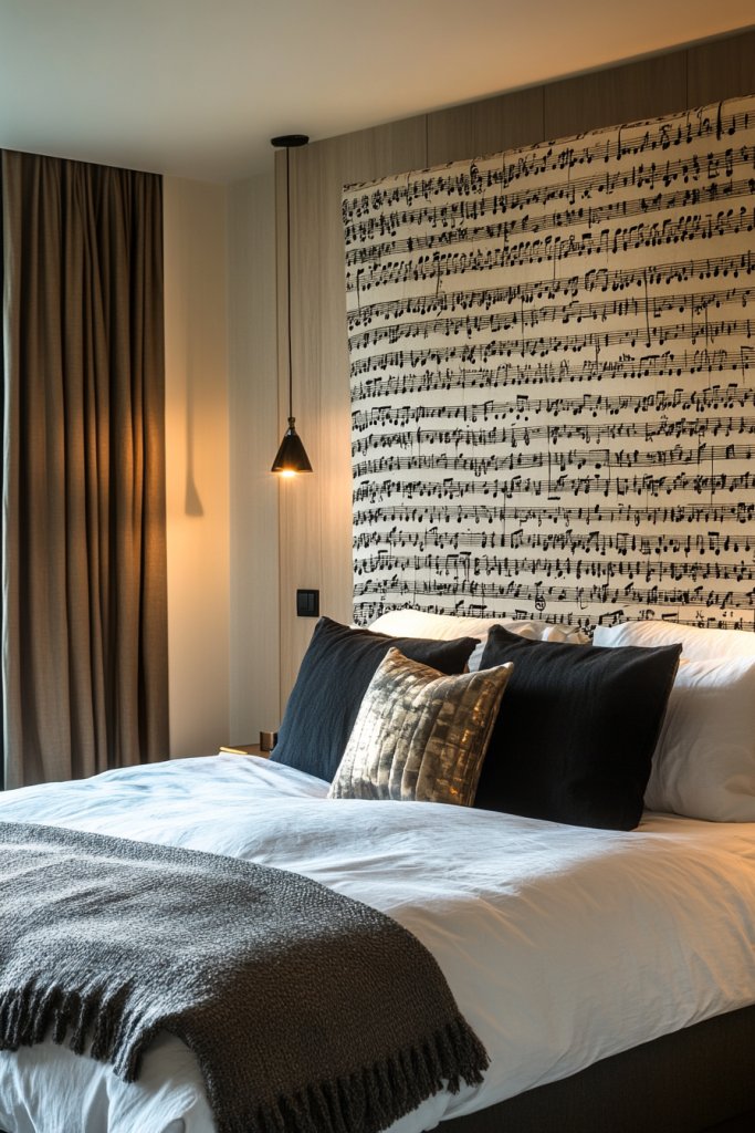 Picture a wall covered in wallpaper featuring musical notes, instruments, or abstract sound waves. The pattern can be subtle or loud, depending on your taste. When paired with minimalist furniture, it becomes a striking backdrop that energizes the room. Textured panels resembling sound waves or sheet music add tactile interest and sophistication.