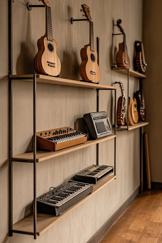 Picture a sleek, wall-mounted shelf with a few carefully arranged guitars, ukuleles, or percussion instruments. The display combines function with aesthetics, turning your room into a mini gallery. The varied shapes and colors of instruments add visual interest, making your space lively and personalized.