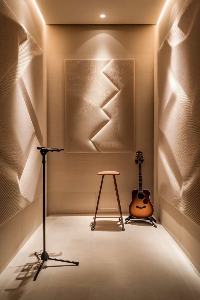 Visualize geometric or textured panels arranged on a wall behind your practice area. They can be in bold colors, neutral tones, or patterned fabrics, matching your decor. The panels absorb sound and reduce echo, making practicing more enjoyable. When lit with ambient lighting, they also serve as a modern design feature. It’s a functional art installation that boosts your musical focus.