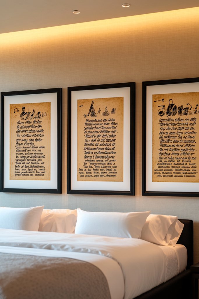 Add small decorative elements like vintage microphones or musical notes around the frames. Personalize further with small LED spotlights or picture lights to illuminate the lyrics at night. Incorporate personal photos or memorabilia among the lyric prints to tell your musical story visually. Rotate the lyric prints periodically to reflect your evolving taste.