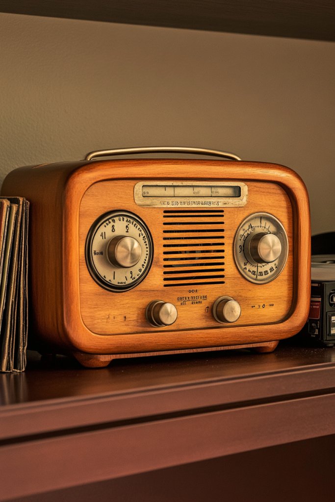 Envision a classic wooden or chrome radio sitting on a shelf or bedside table, emitting a warm glow. The design’s retro curves and dials instantly evoke a bygone era. When turned on, it fills the room with soft crackles and nostalgic tunes, creating a cozy, vintage atmosphere. It combines visual appeal with auditory nostalgia.
