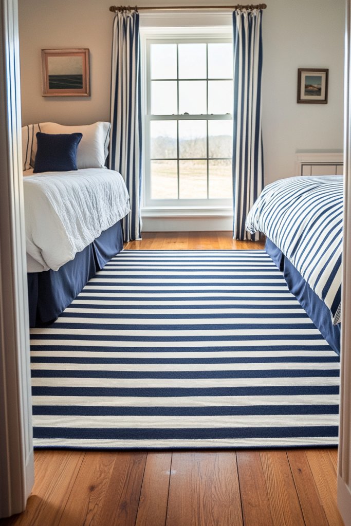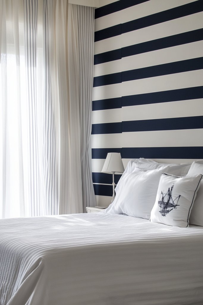 If you crave a design that’s both bold and versatile, this is your go-to solution. Imagine crisp white walls adorned with navy and white striped bedding, reminiscent of sailor uniforms but way more stylish.