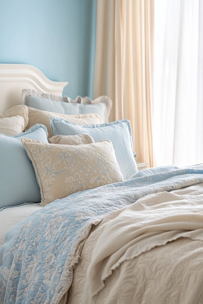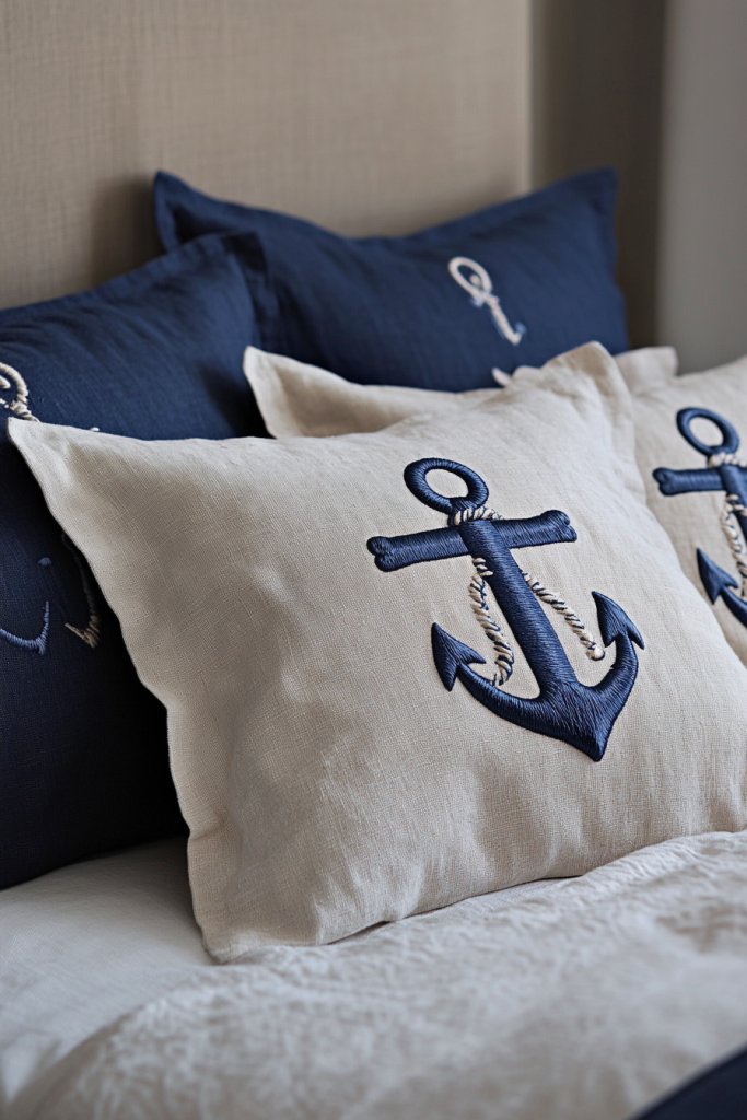 Embellishments like embroidered anchors, braided rope trims, or appliqued shells add tactile interest. They’re casually arranged on your bed or a cozy chair, creating a layered, inviting look.