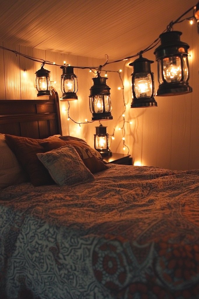 Want soft lighting without the fuss? Lantern string lights are your solution. Picture a string of vintage-style lanterns hanging above your bed or along a wall, casting a gentle amber glow.