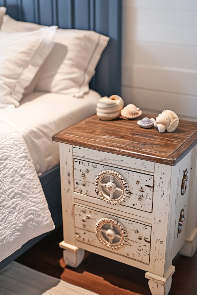 Nautical-themed bedside tables tie your decor together and elevate the room’s style. They’re practical, charming, and full of personality.
