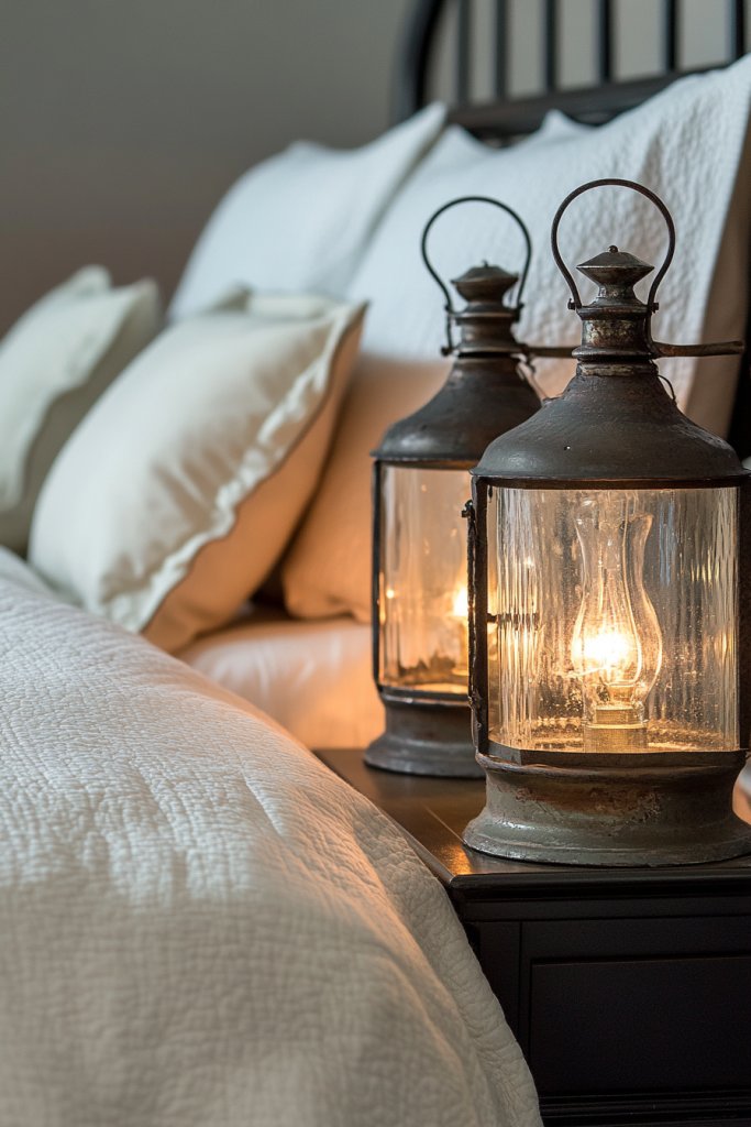 Want your room to feel cozy and nautical at the same time? Lanterns are your answer. Picture wrought-iron lanterns with glass panes hanging beside your bed, casting a gentle flicker across the room.