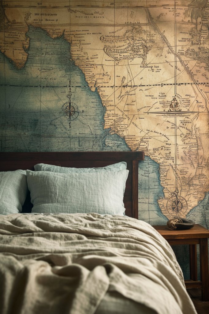 If you’re craving a travel-inspired vibe that’s both educational and stylish, this is your move. Imagine a massive wall covering depicting vintage maritime maps with detailed coastlines and compass roses.