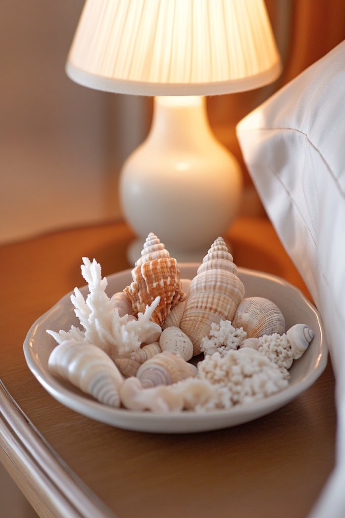 Looking for small, understated ways to bring the beach indoors? Seashells and coral accents add a delicate coastal vibe without overwhelming your decor. They’re perfect for those who love the ocean but prefer a more subtle, refined aesthetic.