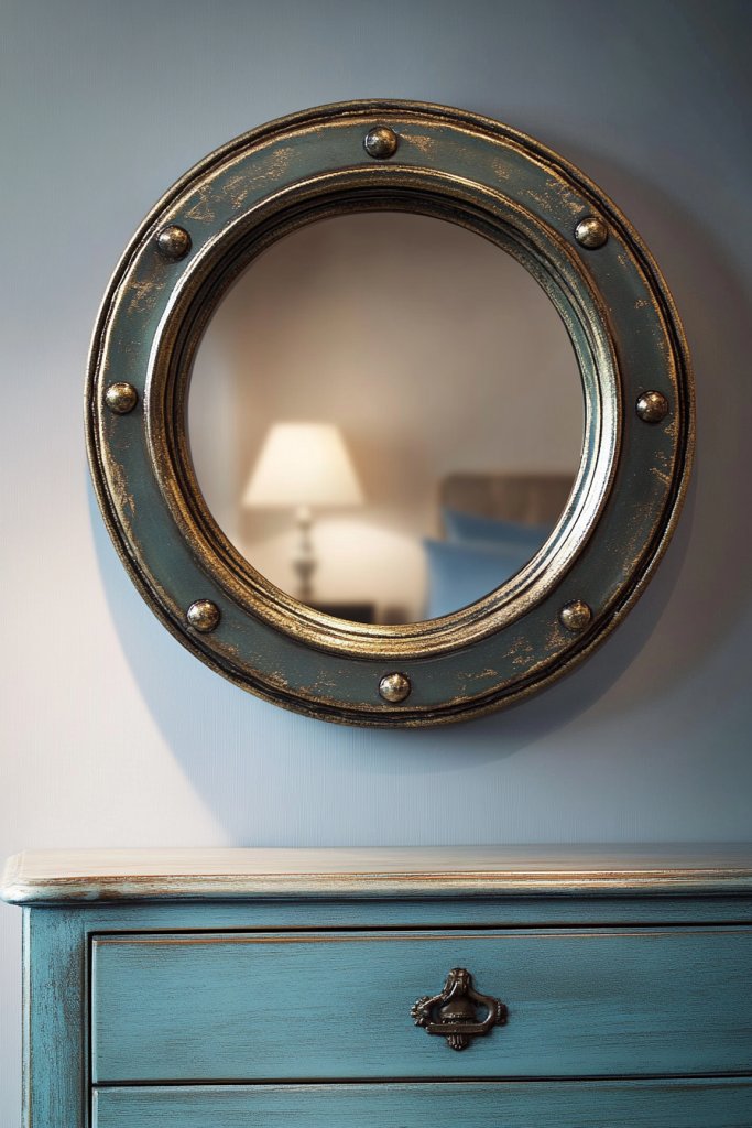 Incorporate a nautical-themed shelf below for displaying souvenirs or books. Use cushions or bedding in coordinating maritime hues to unify the room’s theme.