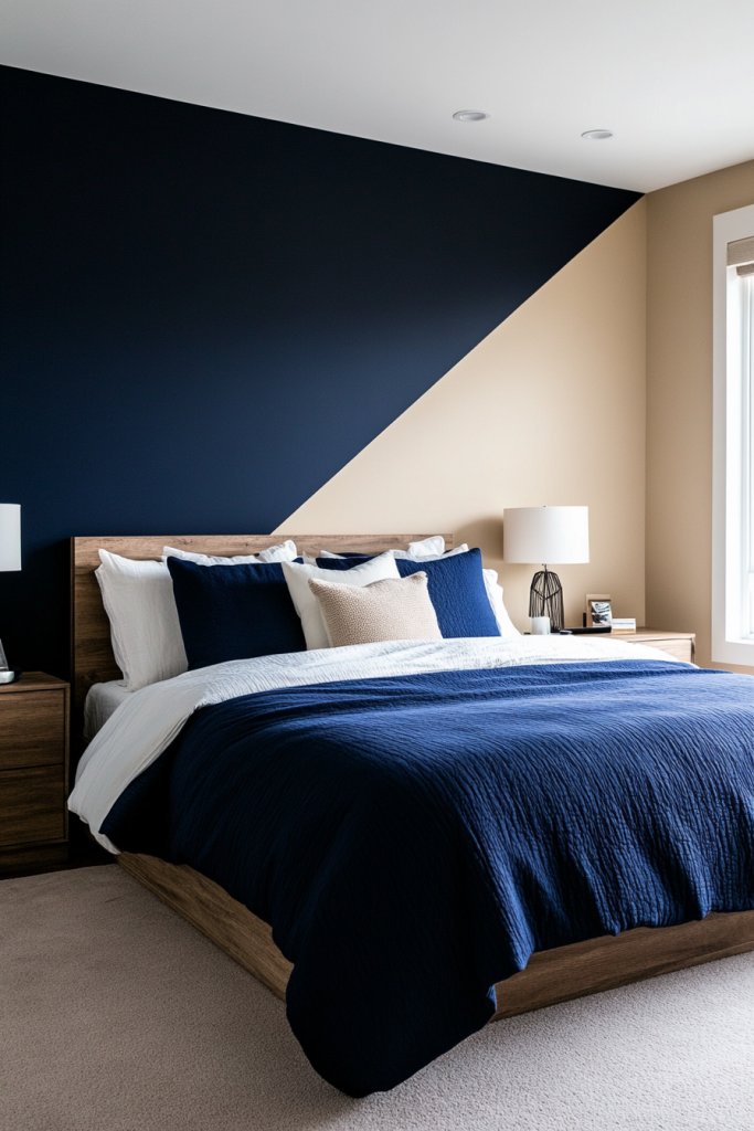 Picture a wall divided into large blocks—navy on top, warm beige below—with clean, sharp lines. The contrasting colors add depth and dimension, making the room appear larger and more dynamic. The overall effect is sleek, with a geometric, modern aesthetic. The bedding in neutral tones complements the wall, completing the balanced look.