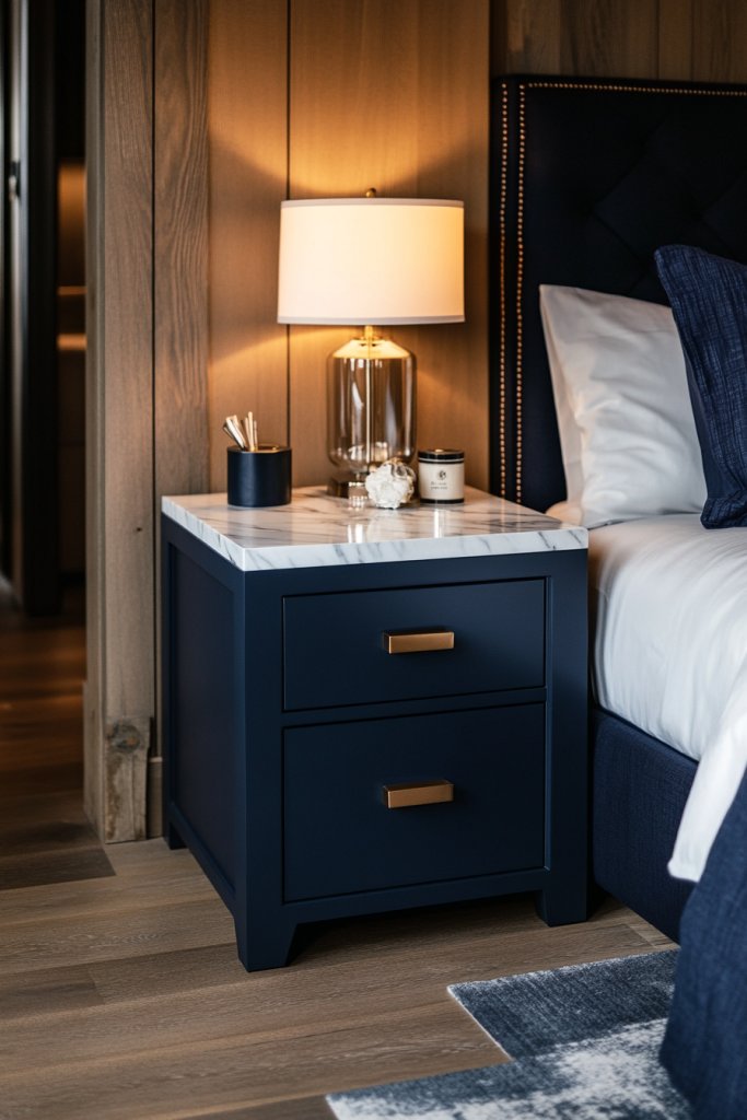 Imagine sleek navy nightstands with smooth, polished marble tops—white or gray veined stones that catch the light. The navy finish adds depth, while the marble’s natural patterns introduce subtle visual interest. The combination creates a balanced, upscale look that’s both modern and timeless. Your bed becomes a statement piece surrounded by elegant details.