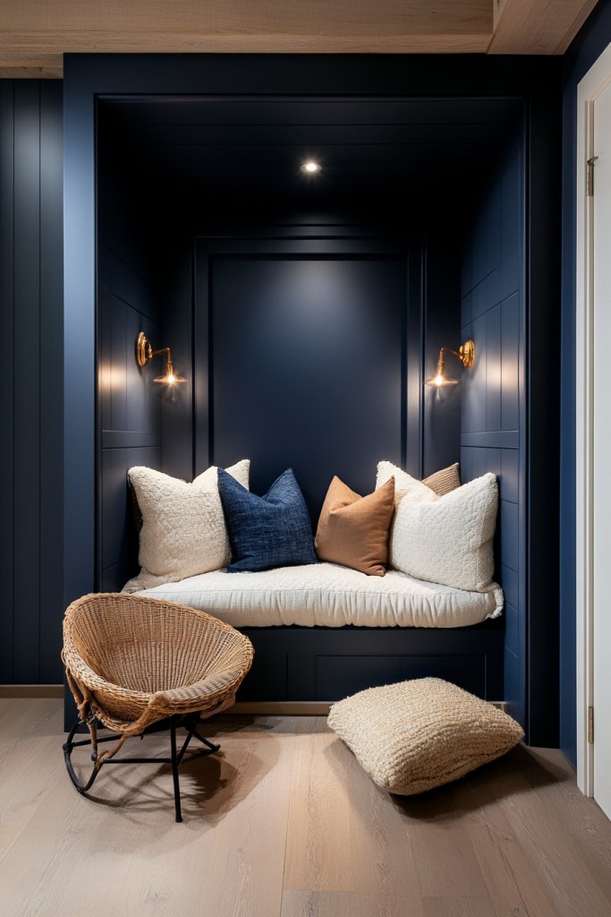 Use textured or matte navy paints for added depth. Incorporate built-in shelves or soft seating like a cushioned bench or pouf. For a seasonal touch, layer in throws or cushions in complementary shades like warm beige or pastel hues. This nook can serve as a reading corner, meditation space, or a quiet workspace.