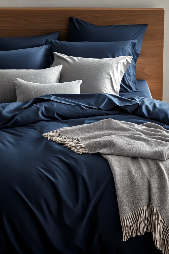 Envision navy sheets with a cozy gray throw blanket and matching pillows. The muted gray tones contrast gently with the deep blue, adding depth without overwhelming. The bedding layers invite touch, while soft ambient lighting enhances the relaxed atmosphere. The overall look is chic, calm, and inviting.