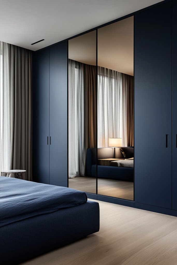Picture navy-painted closet doors with large mirrored panels, reflecting the room’s decor and natural light. The contrast of matte navy against shiny mirrors creates visual interest. The mirrors bounce light around, making even small rooms seem larger. The overall effect is both modern and elegant, enhancing your room’s style.