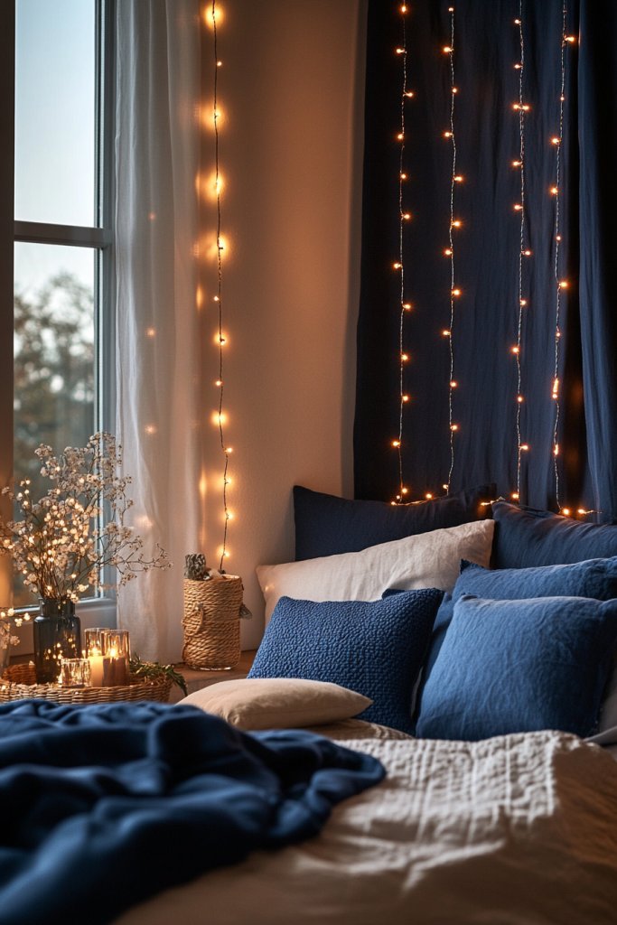 Looking for an easy way to add ambient lighting that’s both stylish and cozy? Navy blue string lights or subtle LED accents create a soft glow perfect for relaxing evenings. They set the mood without overwhelming the space. It’s a simple upgrade that makes your bedroom feel warm and inviting.