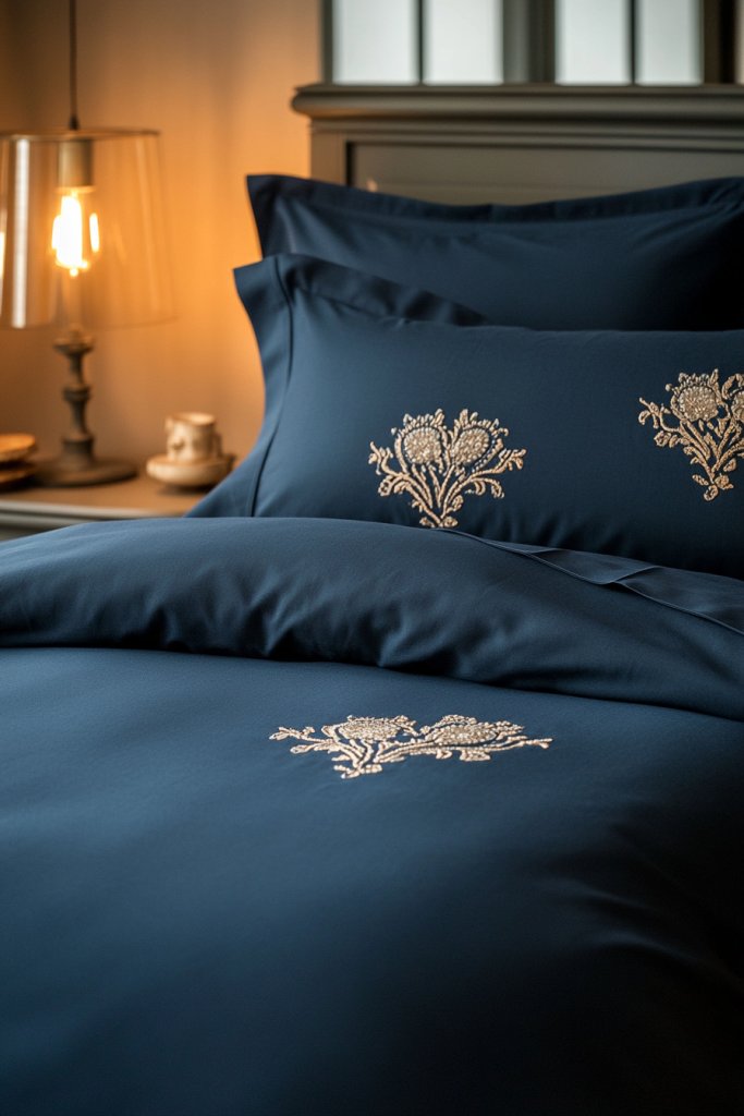 Choose embroidered or patterned duvets in different textures—cotton, linen, or sateen—for variety. Seasonal updates can include lighter fabrics for summer or plush textures for winter. Pair with coordinating pillows in embroidery or subtle prints. Keep the overall bedding neutral or with matching navy accents to maintain harmony.