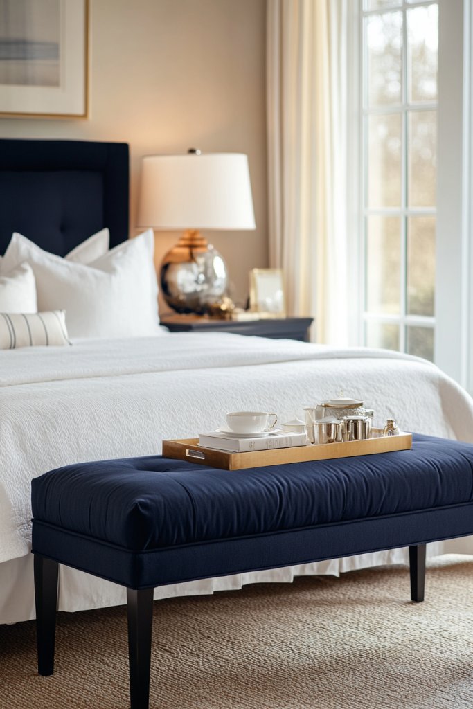 A navy bench or ottoman adds both style and function, transforming your bedroom into a thoughtfully designed retreat. It’s a versatile piece that complements many decor styles—classic, modern, or eclectic. Once in place, it invites you to relax and enjoy your space.