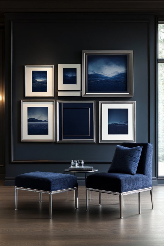 16. Navy Blue Wall Art with Elegant Silver Frames