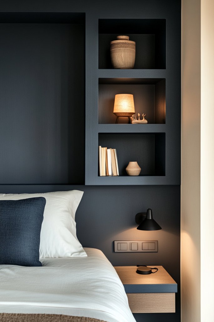 Picture slim navy wall shelves mounted on either side of your bed, holding small decorative objects, books, or essentials. The deep blue adds depth and contrast against light-colored walls. Minimalist brackets or hidden supports keep the look sleek. The shelves create a balanced, organized feel that enhances your decor.