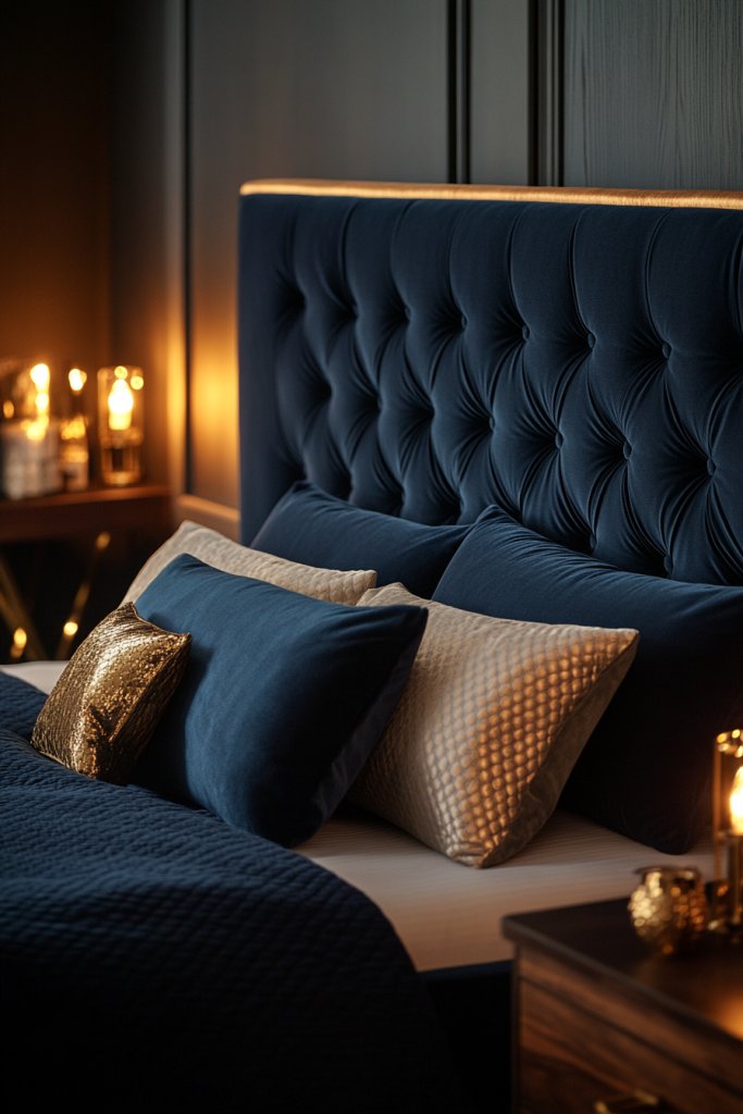 Picture a lush navy fabric headboard with tufted buttons or sleek, smooth upholstery. It’s framed with gold or brass trim, catching the light just enough to add sparkle. The bed is dressed in crisp, white linens, with plush pillows in coordinating shades. Soft ambient lighting highlights the metallic details, creating a sophisticated, cozy sanctuary.
