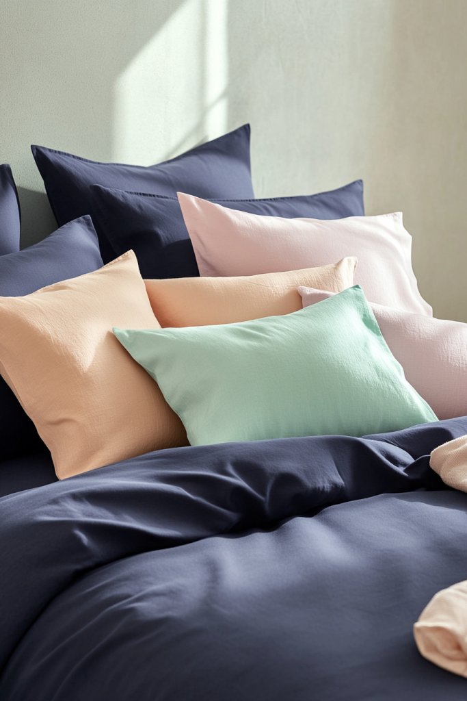 Start with navy bedding as your base. Add pastel cushions, throws, or sheets in coordinating fabrics—cotton, linen, or silk—depending on your preference. Layer textures to avoid a flat look. Keep the overall scheme balanced by repeating the pastel shades throughout the room. Add soft lighting to enhance the calming effect.