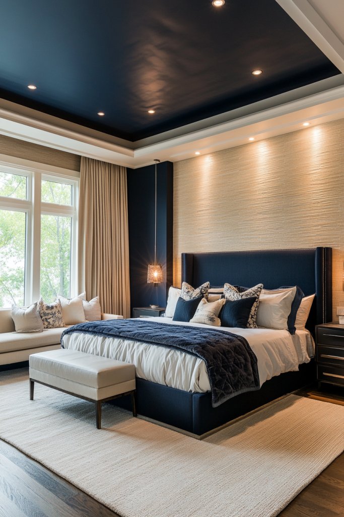 Imagine lying in bed, looking up at a deep navy ceiling that feels like gazing into a calm night sky. The walls are coated in soft, textured paint or fabric-like wallcoverings in light neutral tones, balancing the dark ceiling. Gentle lighting highlights the textures, creating a layered, immersive environment. This contrast makes the room feel both intimate and expansive.
