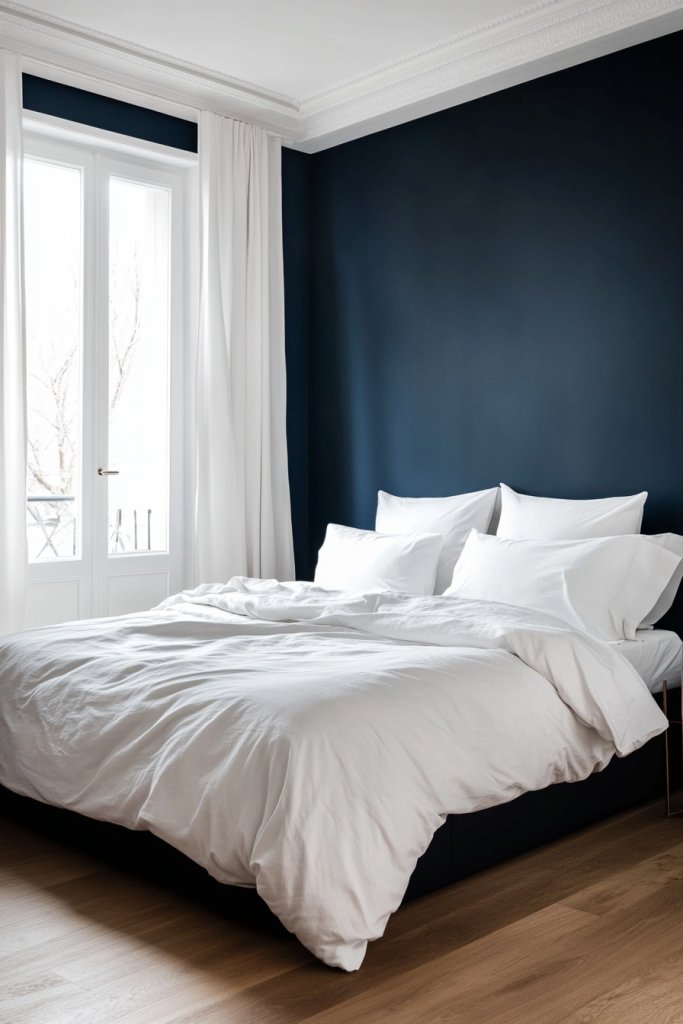 Visualize crisp white bedding topped with a navy duvet or throw blanket. The furniture features clean lines in white or light wood, with subtle navy accents in pillows or throws. Walls are painted a soft matte navy, creating a seamless monochrome look that feels serene and uncluttered. Soft, textured textiles and smooth surfaces enhance the minimalist aesthetic.