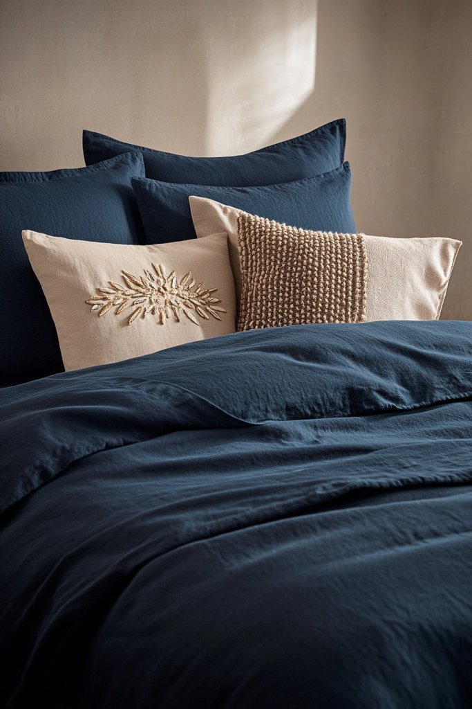 Start with a solid navy duvet or comforter as your base. Select pillows in a mix of sizes and textures—square, rectangular, and round. Use inserts that hold their shape for a polished look. Arrange the pillows in a balanced but slightly casual manner—stacked or scattered—depending on your vibe. Add a textured throw blanket in a neutral hue for extra coziness.